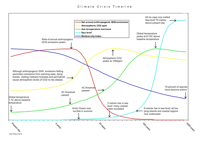 Climate Crisis Timeline For the climate crisis timelime in pdf, click here note: a UN report released on 23/09/19 suggests that GHG emissions will not peak until at least 2030. This would put the nearest date for net zero emissions far beyond 2050. Report In 2016 , we speculated that the earth's climate had already passed a critical tipping point, and was on a irreversible trajectory that would lead to global warming of in excess of 3C and massive impacts to the earth's ecosystem, including the parts essential to human survival. Nothing that has happening in the intervening years has altered this view. In fact, thanks to the failure of governments everywhere to act decisively, the prospects for human survival have significantly diminished. During July, all time temperature records were shattered across a swathe of European countries, in some cases by several degrees. Global temperatures for July were 1.2C above the pre-global warming baseline temperature, suggesting that the 1.5C threshold that the Paris international climate agreement of April 2016 sought to prevent and which climate change projections at the start of the millennia suggested would not occur for at least another 50 years, will be exceeded within as little as eight to ten years. Meanwhile, Arctic sea ice is at an all time low for the time of year, icemelt on the Greenland icecap during July was greater than for the whole of last year, and unprecedented numbers of forest fires rage across Russia, Canada and Alaska. In Siberia alone, 2.7 million hectares of forest are ablaze (roughly equivalent in area to Belgium). And this is only a tiny taste of what global warming will bring.