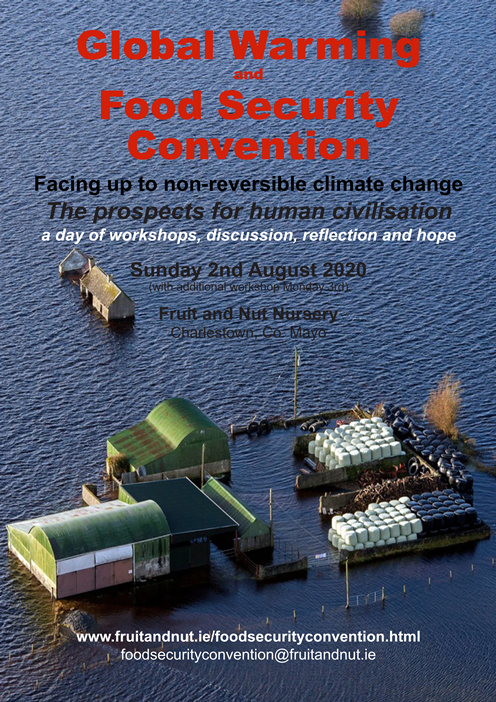 Deep Blue: Facing up to non-reversible climate change. The melting of the polar summer ice and the prospects for human civilisation 4th Global Warming and Food Security Convention Sunday 2nd August 2020 This unique event will examine the options for preparing for catastrophic or near-catastrophic climate change. Attention will be drawn to the unavoidable consequences of anthropogenic greenhouse gas emissions that are already resident in the earth's atmosphere - or that will be in the near future - and on the various non-reversable feedbacks that are now being triggered (deep blue is the colour of the ice-free Arctic ocean when seen from space). The convention takes it as a given that global warming will have very serious impacts upon human civilisation. The discussion will not concern itself with emissions reductions or strategies for achieving these but will examine future global warming scenarios and the likely adaptations required at community level, particular in terms of food security. Ireland Ireland is very poorly prepared for climate change. It currently imports 75-80 percent of all food consumed and much of this food originates in countries that will be impacted upon negatively by climate change. The Irish agriculture sector, which is primarily focused on livestock production for the export market, imports 3 million tonnes of animal feed and 1.3 million tonnes of fertiliser every year. It is highly vulnerable to disruptions in global supply chains, including climate change impacts on the countries producing the animal feed. In terms of food security, it is absolutely essential that Ireland acquires the skills, knowledge and ability to produce much more of the food it requires. Gender roles It is acknowledged that the countries in which female representation in political decision making processes is highest (for example the Nordic countries) are also the same countries that prioritise care for the environment. Conversely, the countries where the proportion of women in politics is lowest (for example the United States and Australia) are also the countries where climate change mitigation proposals are routinely obstructed by corporate and other vested interests. Are the alpha males who typically fill positions of power incapable of roles involving stewardship of the earth's resources or empathy with the wider biosphere? It certainly looks like it. According to Donald Trump, the president of the United States and also the poster child for alpha male aggression, global warming is a 'hoax'. Meanwhile, back on planet Earth, fourteen of the fifteen hottest years ever recorded have been in the last fifteen years, and the carbon dioxide concentration in the atmosphere is at the highest level for millions of years. The convention sees the empowerment of women as a critical part of any climate change survival plan. The role of the convention The convention is aimed primarily at people who want to play an active role in helping their communities prepare for climate change. It is aimed at community activists, educators, planners, growers or intending growers and other people with an interest in food security. The event will comprise a number of practical workshops aimed at developing awareness of the type of problems human society will face. The workshops will be scenario based, problem-orientated and will be of a practical nature. Although some workshops will take place indoors, participants should come prepared for outdoor conditions and should bring boots and raingear. For logistical reasons the event will be limited to 36 participants. Venue Fruit and Nut nursery was selected as the venue as it provides a working demonstration of what can be achieved with very minimal resources. In addition to being at the forefront of research into nut production in Ireland and the possible applications in terms of future food security, the nursery also has a growing expertise in sustainable land-management practices relevant to localised food production. Convention participants will have the opportunity to see some of the on-going work taking place at the nursery, including nut trialling, land rehabilitation and micro-climate modification. Schedule Opening Talk: What Do We Tell The Children? How do we explain that the world is on course for a 3.5-5C rise in temperature (with a significant risk of even higher temperatures) , with a potentially catastrophic outcome for our species? That the dangers of global warming from human-caused greenhouse gas emissions were acknowledged by the world as far back as the early 90s (for example the Rio de Janeiro Earth Summit in 1992) yet for decades nothing was done? That vested corporate interests created a bogus debate that their pet politicians then helped keep alive? That even the people who believed global warming was real were too caught up in their own lives, or just too powerless to effectively intervene? What exactly do we tell our children? That they'd better learn how to grow staple foods, build flood defences, and help develop community self-reliance for the day when the government can no longer be relied on to help? Or do we just pretend things will just continue as they are? Workshop One: Squirrels, Acorns, Foxes and Bunnies It is the year 2052 and after decades of political inaction, prevarication and downright incompetence, the region is now facing major food shortages. As winter approaches, there are elections for the regional government. Against all predictions, the Radical party take the most seats. The radicals have no prior experience in government yet have to act quickly to address the growing food crisis. You are one of the new representatives. Along with the other members of the regional council, you have to put together a draft policy on food security for the next five years. Lunch Workshop Two: The Enemy Within Climate change brings with it all manner of unwelcome visitors: invasive plants that take over agricultural land, voracious insects th