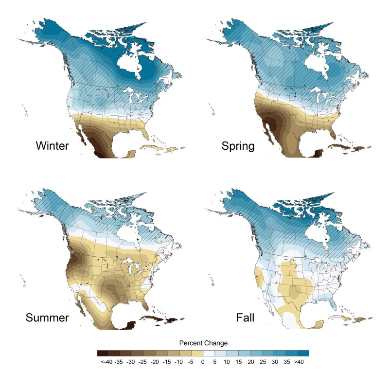 Precipitation Maps North America (Projected changes in precipitation 1961-1980 to 2080-2099) Source: United States Environmental Protection Agency The most notable impact is likely to be on California, the leading producer of many crops in the United States. California produces over 99 percent of the United States' almond, pistashio, walnut and rice crops, 97 percent of the plums and kiwis, 95 percent of the garlic, 60 percent of all carrots grown in the United States, and is the leading US producer of many other fruits and vegetables, as well as the being the largest dairy producer. In addition to supplying the rest of the United States, California also exports food to many other countries. The principal markets are Canada, the EU, Japan, China and Mexico. Excluding wine, the main agricultural exports are nuts, rice, dairy products and fruit. California is already experiencing severe water shortages, as are the neighbouring states of Arizona, New Mexico, Nevada and Utah. All of these states can expect significantly reduced precipitation as the effects of global warming bite. Paris Talks Although hailed as a success, the most notable feature of Paris was the absence of any binding reduction targets or dates. Even if all the pledges made by the participating nations are actually implemented (a highly unlikely scenario given the political considerations for the governments involved) the world is still on course for a 2.7-3.0°C rise on pre-industrial temperatures. Unfortunately, the1.5°C aspirational target mentioned in the Paris agreement is now almost beyond reach. The text of the Paris agreement can be read here