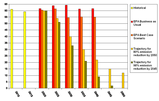 Reality gap in Irish government policies Reality gap between national greenhouse gas emission reduction targets and the trajectory of current policies Source of information regarding Irish greenhouse gas emissions 2020-2040 attributable to current state policies: Irish Environmental Protection Agency 2019. Optimum trajectory for 80% emission reduction by 2050 and emissions trajectory required in order to achieve 98% emissions reduction by 2045 calculated by Andi Wilson. Note: an 80% reduction in emissions by 2050 would be non-compliant with the EU target, which is 100%. However, it must be said that the EU zero net emissions target date of 2050 is unambitious and does not reflect the imperative to bring global net emissions to zero by the earliest achievable date. The Fruit and Nut position is that Ireland needs to achieve a 45% reduction of emissions (from current levels) by 2030, 65% by 2035, 85% by 2040 and 98% by 2045. The two main strands of this objective are (1) reducing agricultural emissions by 75% by 2030 (thereby reduce total emissions by around 25%) and (2) planting by 2030 sufficient broadleaved trees to sequester carbon equivalent to half of Ireland's current emissions by 2045. The remaining emission reductions can be achieved through savings in the transport and residential sectors. These proposals build on the food security document produced by Andi in 2019 and will be published in the near future. The original document is can be found at the food security link above. Note: the 45% emission reduction by 2030 proposed here is actually less steep than the ambitious target set by the Irish Green party (55% reduction by 2030). However no details have been produced by the Green party as to how such a steep reduction might be achieved (Green party please take note! If anyone in the GP has the calculations, we'd be happy to post them here)